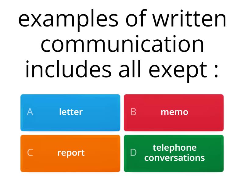 Multiple choice questions of Communication skills Anand Charitable Types Of Written Communication Quiz Aes during active listening, understanding is the process of: study with quizlet and memorize flashcards containing terms like mike, an office assistant, created a letter for dr. Find other quizzes for other and more on quizizz for free! test your knowledge on the different types of communication with this quiz. written communication quiz for 9th grade students.. Types Of Written Communication Quiz Aes.